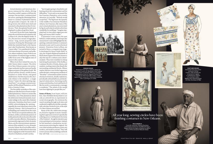 If plantation tours screen the past behind a cordon sanitaire, Scott hopes the reenactment's route will highlight the disquieting continuity between Louisiana's plantation past and its petrochemical present. Downriver from LaPlace, we arrived in Norco, a company town largely developed by Royal Dutch Shell. In 1953, the oil giant displaced hundreds of black sharecroppers from their homes to clear the way for a refinery and a chemical plant. They were resettled on cheap land along the perimeter of the facility, a Louisiana Mordor of docks, drums, and catalytic cracking towers that dwarfs the surrounding residential blocks. Where captive laborers once boiled sugarcane under the lash, contemporary residents of "fenceline" communities endure noxious chemical emissions, deadly explosions, periodically unbreathable air, and declining real-estate prices. Surveying nearby houses and churches, Scott said that he'd like his work to communicate a message to residents: "The rebels of 1811 would have been fighting for people like you."