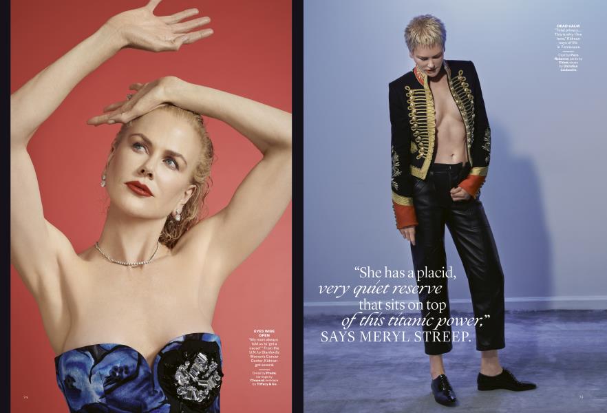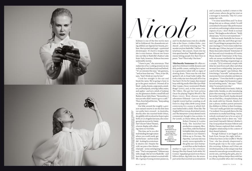 This bucolic Tennessee life offers respite from Kidman's wildly dynamic and duly prolific career, making her a once-in-a-generation talent with no signs of slowing down. There was the role that ignited it all, in Dead Calm (1989). She took a risky star turn that paid off in Gus Van Sant's To Die For (1995), then stayed busy with big studio films like Eyes Wide Shut (1999), Oscar-nominated Moulin Rouge! (2001), and, in that same year, The Others. She got her best-actress Oscar for playing Virginia Woolf in The Hours (2002). More obscure artistic adventures followed—Lars von Trier's Dogville (2003) had her crawling on all fours in a dog collar; Birth (2004) drew controversy for a scene in which Kidman bathed with a child. Films like The Stepford Wives (2004), Bewitched (2005), and The Interpreter (2005) skewed more commercial, though to less acclaim. In Fur (2006), as Diane Arbus, she shaves Robert Downey Jr.'s entire body. She launched her production company, Blossom Films, with the festival hit Rabbit Hole, then pushed new limits in Lee Daniels's follow-up to Precious, The PaperBoy. Last year she was nearly unrecognizable in the gritty neo-noir Destroyer, and then as the Southern mother to a gay son in the conversion therapy film Boy Erased, both while DC Comics' Aquaman grossed more than a billion dollars. Big Little Lies, the seven-part series that received 19 nominations and 13 awards, marked a return to the small screen, where she got her start as a teenager in Australia. This V.F. cover makes her 10th.