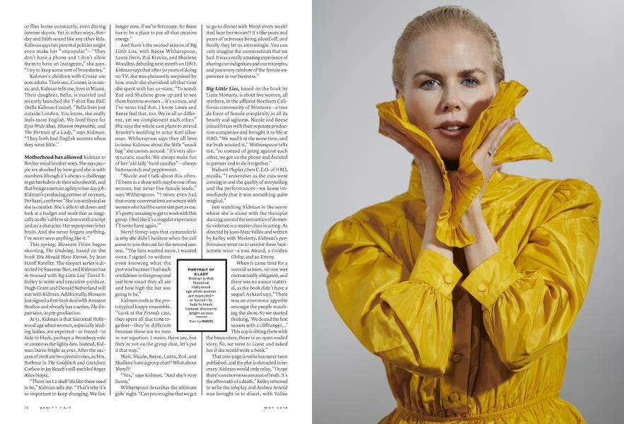 And there's the second season of Big Little Lies, with Reese Witherspoon, Laura Dern, Zoe Kravitz, and Shailene Woodley, debuting next month on HBO. Kidman says that after 30 years of doing no TV, she was pleasantly surprised by how much she cherished all that time she spent with her co-stars. "To watch Zoe and Shailene grow up and to see them become women... it's so nice, and I've never had that. I know Laura and Reese feel that, too. We're all so different, yet we complement each other." She says the whole cast plans to attend Kravitz's wedding to actor Karl Glusman. Witherspoon says they all love to tease Kidman about the little "snack bag" she carries around. "It's very idiosyncratic snacks. We always make fun of her 'old lady' hard candies"—always butterscotch and peppermint.
