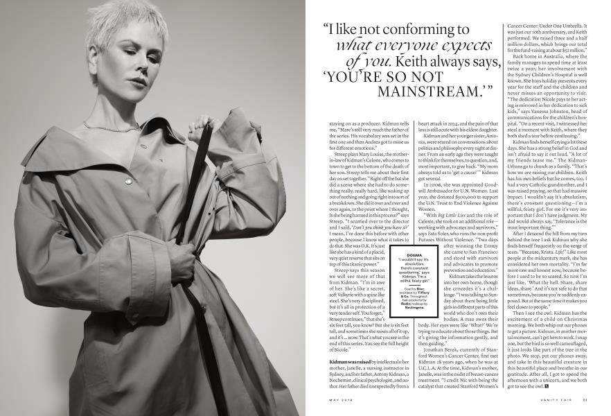 Kidman finds herself crying a lot these days. She has a strong belief in God and isn't afraid to say it out loud. "A lot of my friends tease me." The Kidman-Urbans go to church as a family. "That's how we are raising our children. Keith has his own beliefs but he comes, too. I had a very Catholic grandmother, and I was raised praying, so that had massive impact. I wouldn't say it's absolutism, there's constant questioning—I'm a willful, feisty girl. For me it's very important that I don't have judgment. My dad would always say, 'Tolerance is the most important thing.'"