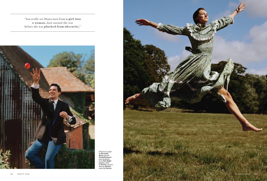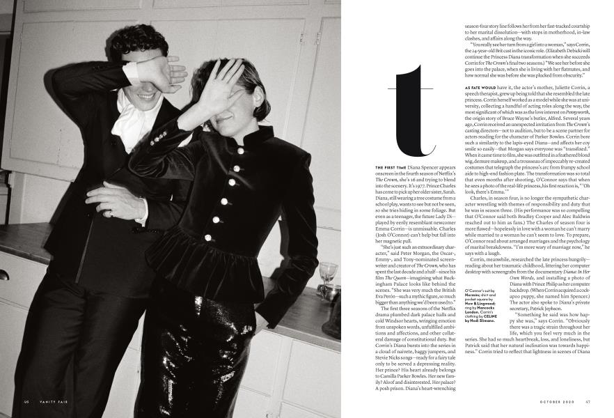 AS FATE WOULD have it, the actor's mother, Juliette Corrin, a speech therapist, grew up being told that she resembled the late princess. Corrin herself worked as a model while she was at university, collecting a handful of acting roles along the way, the most significant of which was as the love interest on Pennyworth, the origin story of Bruce Wayne's butler, Alfred. Several years ago, Corrin received an unexpected invitation from The Crown's casting directors—not to audition, but to be a scene partner for actors reading for the character of Parker Bowles. Corrin bore such a similarity to the lapis-eyed Diana—and affects her coy smile so easily—that Morgan says everyone was "transfixed." When it came time to film, she was outfitted in a feathered blond wig, demure makeup, and a trousseau of impeccably re-created costumes that telegraph the princess's arc from frumpy school aide to high-end fashion plate. The transformation was so total that even months after shooting, O'Connor says that when he sees a photo of the real-life princess, his first reaction is, " 'Oh look, there's Emma.' "