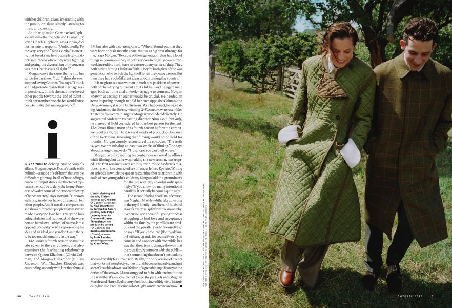 IN ADDITION TO delving into the couple's affairs, Morgan depicts Diana's battle with bulimia—a mode of self-harm that can be difficult to portray, in all of its shadings, onscreen. "It just struck me that to not represent it would be to deny the former Princess of Wales some of the true complexity of her character," says Morgan. "Her own suffering made her have compassion for other people. And it was the compassion she showed for other people that was what made everyone love her. Everyone has vulnerabilities and frailties. And she wore hers on her sleeve—which, of course, is the opposite of royalty. You're representing an idea and an ideal, and you don't want there to be too much humanity in the way."