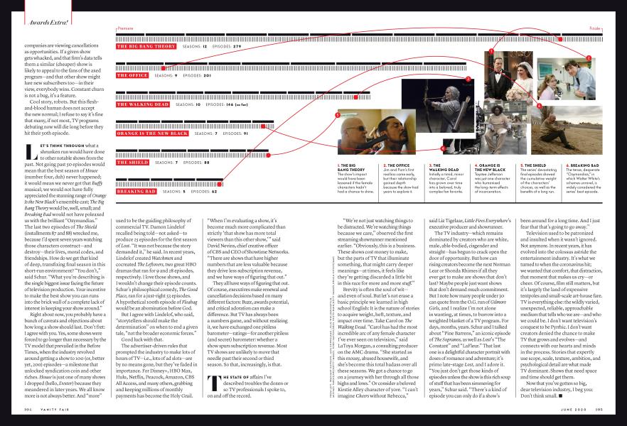 LET'S THINK THROUGH what a shrunken run would have done to other notable shows from the past. Not going past 50 episodes would mean that the best season of House (number four, duh) never happened; it would mean we never got that Buffy musical; we would not have fully appreciated the stunning range of Orange Is the New Black's ensemble cast; The Big Bang Theory would be, well, small; and Breaking Bad would not have poleaxed us with the brilliant "Ozymandias." The last two episodes of The Shield (installments 87 and 88) wrecked me, because I'd spent seven years watching those characters construct—and destroy—their lives, moral codes, and friendships. How do we get that kind of deep, transfixing final season in this short-run environment? "You don't," said Schur. "What you're describing is the single biggest issue facing the future of television production. Your incentive to make the best show you can runs into the brick wall of a complete lack of interest in keeping your show around."