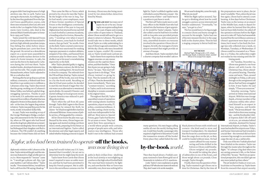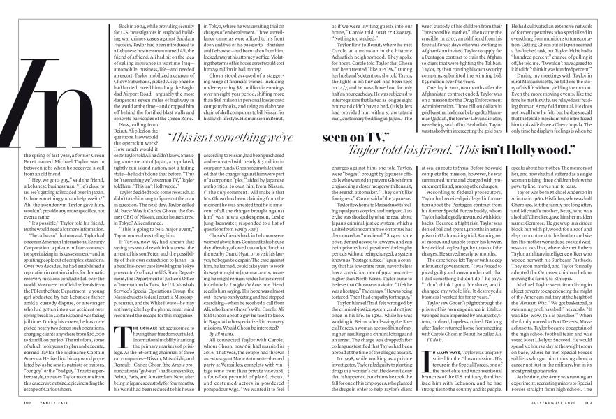 IN MANY WAYS, Taylor was uniquely suited for the Ghosn mission. His tenure in the Special Forces, one of the most elite and unconventional branches of the U.S. military, familiarized him with Lebanon, and he had strong ties to the country and its people. He had cultivated an extensive network of former operatives who specialized in everything from munitions to transportation. Getting Ghosn out of Japan seemed a far-fetched task, but Taylor felt he had a "hundred percent" chance of pulling it off, he told me. "I wouldn't have agreed to it if I didn't think it was hundred percent."