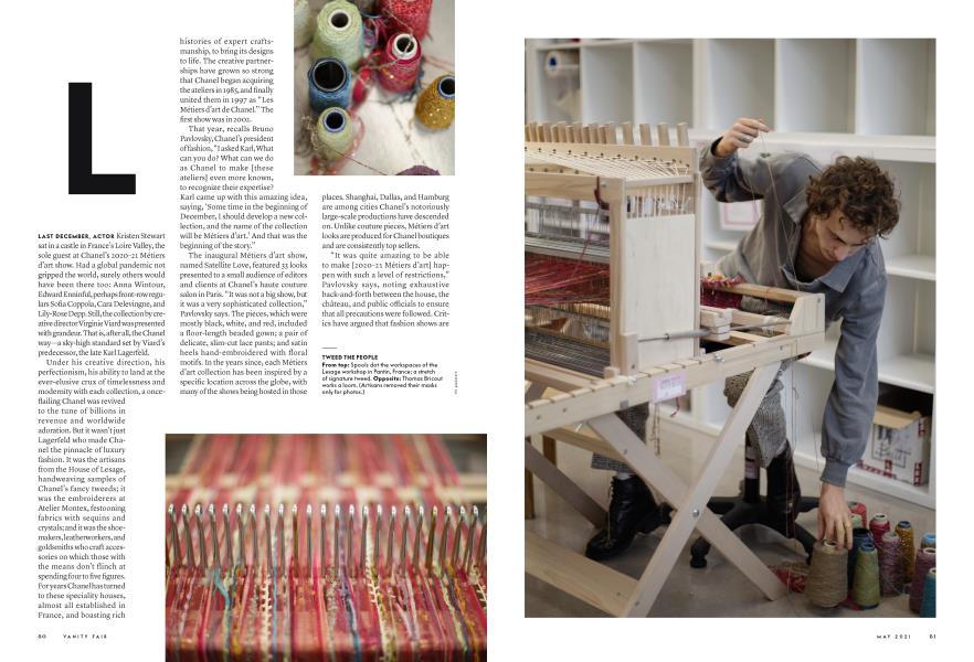 May 2021 LEAH FAYE COOPER TOMAS VAN HOUTRYVELast December, actor Kristen Stewart sat in a castle in France’s Loire Valley, the sole guest at Chanel’s 2020–21 Métiers d’art show. Had a global pandemic not gripped the world, surely others would have been there too: Anna Wintour, Edward Enninful, perhaps front-row regulars Sofia Coppola, Cara Delevingne, and Lily-Rose Depp. Still, the collection by creative director Virginie Viard was presented with grandeur. That is, after all, the Chanel way—a sky-high standard set by Viard’s predecessor, the late Karl Lagerfeld.