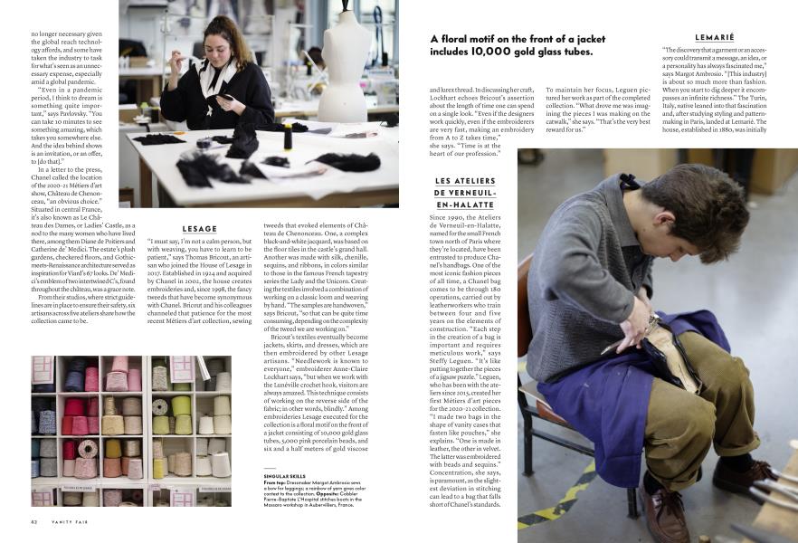Since 1990, the Ateliers de Verneuil-en-Halatte, named for the small French town north of Paris where they’re located, have been entrusted to produce Chanel’s handbags. One of the most iconic fashion pieces of all time, a Chanel bag comes to be through 180 operations, carried out by leatherworkers who train between four and five years on the elements of construction. “Each step in the creation of a bag is important and requires meticulous work,” says Steffy Leguen. “It’s like putting together the pieces of a jigsaw puzzle.” Leguen, who has been with the ateliers since 2015, created her first Métiers d’art pieces for the 2020–21 collection. “I made two bags in the shape of vanity cases that fasten like pouches,” she explains. “One is made in leather, the other in velvet. The latter was embroidered with beads and sequins.” Concentration, she says, is paramount, as the slightest deviation in stitching can lead to a bag that falls short of Chanel’s standards. To maintain her focus, Leguen pictured her work as part of the completed collection. “What drove me was imagining the pieces I was making on the catwalk,” she says. “That’s the very best reward for us.”