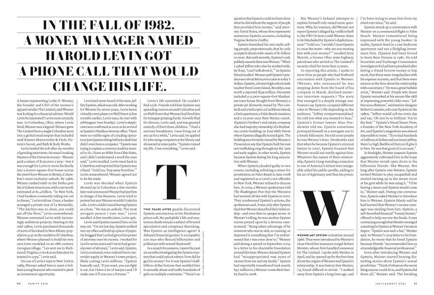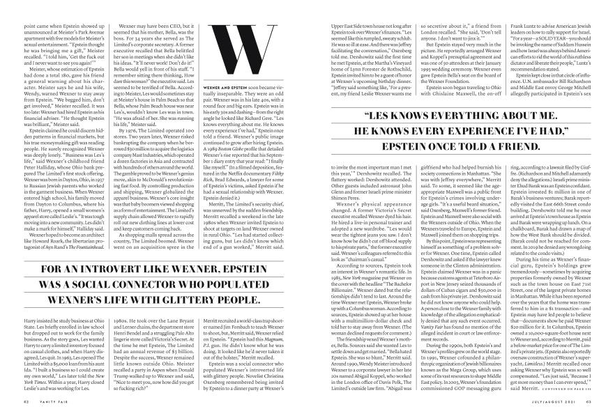 WEXNER AND EPSTEIN soon became virtually inseparable. They were an odd pair. Wexner was in his late 40s, with a round face and big ears. Epstein was in his early 30s and dashing—from the right angle he looked like Richard Gere. "Les knows everything about me. He knows every experience I've had," Epstein once told a friend. Wexner's public image continued to grow after hiring Epstein. A1989 Boston Globe profile that detailed Wexner's rise reported that his September 1 diary entry that year read: "I finally like myself." (In a filmed deposition, featured in the Netflix documentary Filthy Rich, Brad Edwards, a lawyer for some of Epstein's victims, asked Epstein if he had a sexual relationship with Wexner. Epstein denied it.)