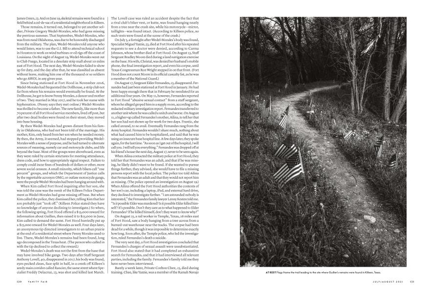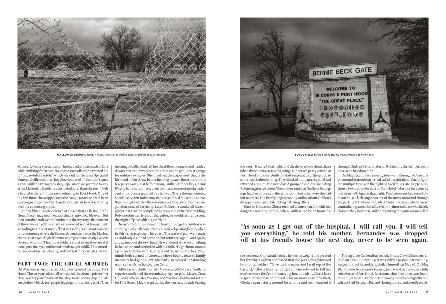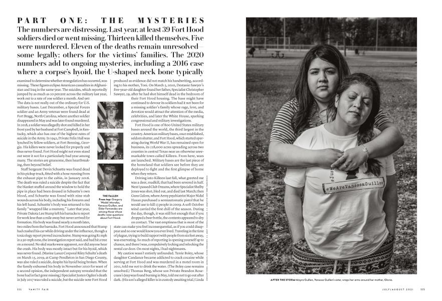 July/August 2021 MAY JEONG DEVIN OKTAR YALKINThe numbers are distressing. Last year, at least 39 Fort Hood soldiers died or went missing. Thirteen killed themselves. Five were murdered. Eleven of the deaths remain unresolved—some legally; others for the victims' families. The 2020 numbers add to ongoing mysteries, including a 2016 case where a corpse's hyoid, the U-shaped neck bone typically examined to determine whether strangulation has occurred, was missing. These figures eclipse American casualties in Afghanistan and Iraq in the same year. The suicides, which reportedly jumped by as much as 20 percent across the military last year, work out to a rate of one soldier a month. And yet: The data is not really out of the ordinary for U.S. military bases. Last December, a Special Forces soldier and an Army veteran were found dead at Fort Bragg, North Carolina, where another soldier disappeared in May and was later found murdered. In 2018, a soldier was allegedly shot and killed in her front yard by her husband at Fort Campbell, in Kentucky, which also has one of the highest rates of suicide in the Army. In 1941, Private Felix Hall was lynched by fellow soldiers, at Fort Benning, Georgia. His killers were never looked for properly and thus never found. Fort Hood might not even stand out were it not for a particularly bad year among many. The stories are gruesome, then heartbreaking, then beyond belief.