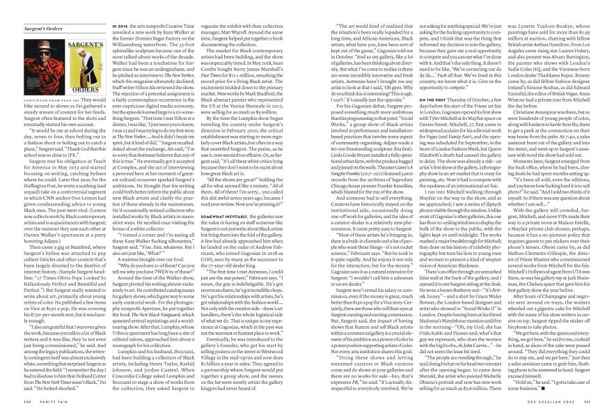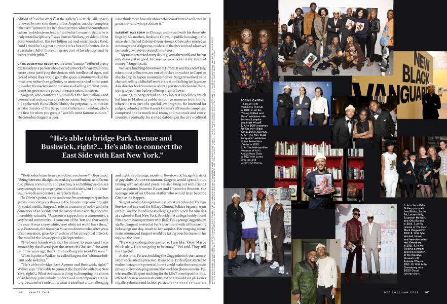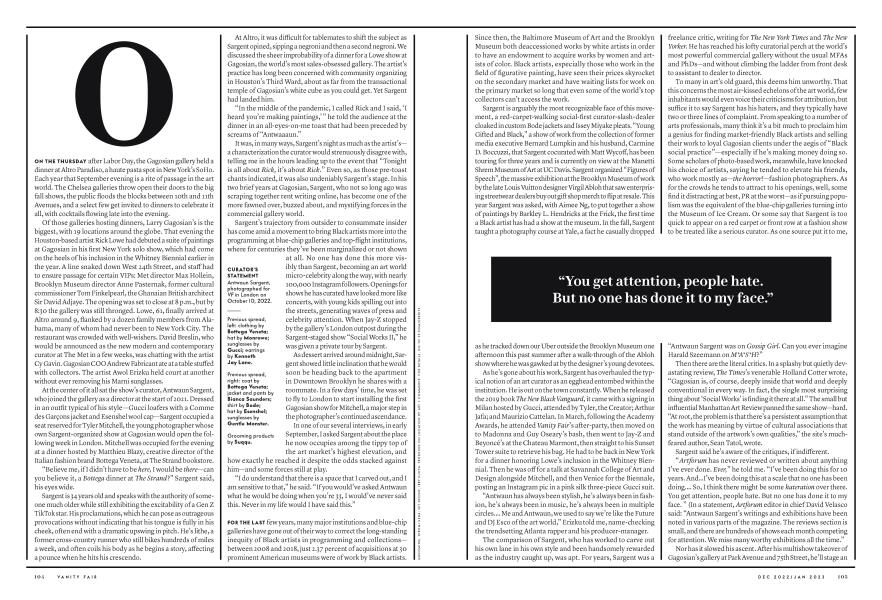December 2022/January 2023 Nate Freeman Rafael Pavarotti, MICHAEL OSTUNI, Patrick Mcmullan, SANSHO SCOTT, ZACH HILTY, NICOLAS TUCAT, MADISON VOELKEL, CLINT SPAULDING, MIKE VITELLI, YVONNE TNT, VITTORIO ZUNINO CELOTTOANTWAUN SARGENT has crashed the art world's most guarded gates, elevating dozens of Black artists along the way. In the process he's become the most buzzed-about curator-gallerist on the scene, whether the establishment likes it or not.