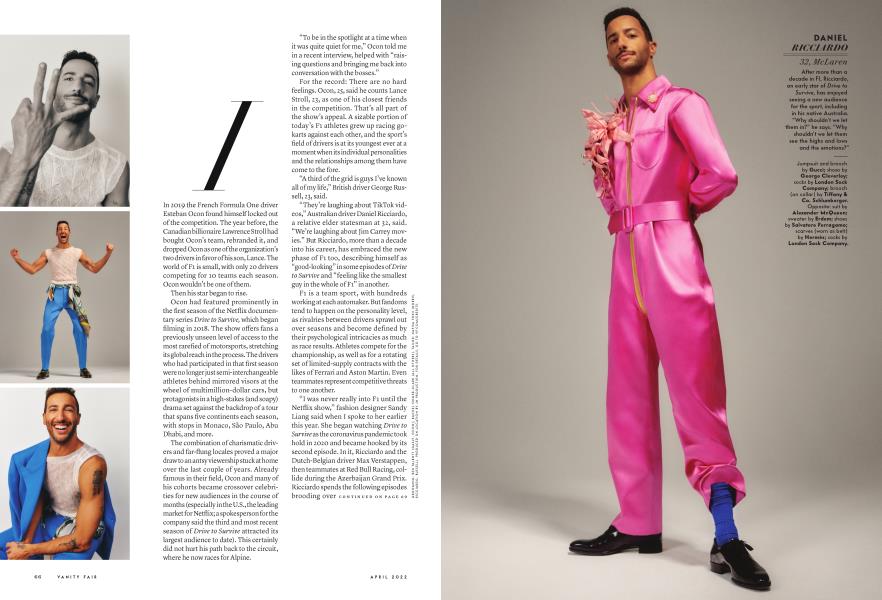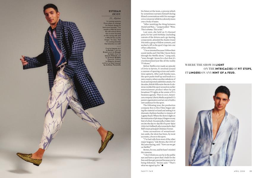 April 2022 DAN ADLER NICK RILEY BENTHAM MICHAEL DARLINGTONFORMULA ONE RACING IS OUR LATEST REALITY TV OBSESSION—AND THE MEN BEHIND THE WHEEL ARE SHIFTING INTO NEW LEVELS OF GLOBAL CELEBRITY