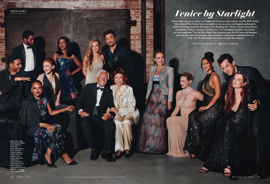 Dec 2023 / Jan 2024 BRETT LLOYDLabor strikes may have dulled the Hollywood firmament this autumn, but the 80th Venice International Film Festival shone as bright as ever as actors and legends gathered to celebrate Giorgio Armani’s first show in the floating city. “Venice means extraordinary atmosphere, history, romance,” Armani says. “It is incredibly beautiful; everywhere you look captivates.” For his One Night Only Venezia event, the 89-year-old designer took over the imposing Arsenale and mounted a runway show inspired by his love of the city. VF and friends were there to mark the moment.