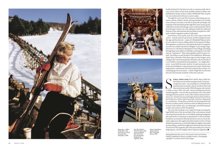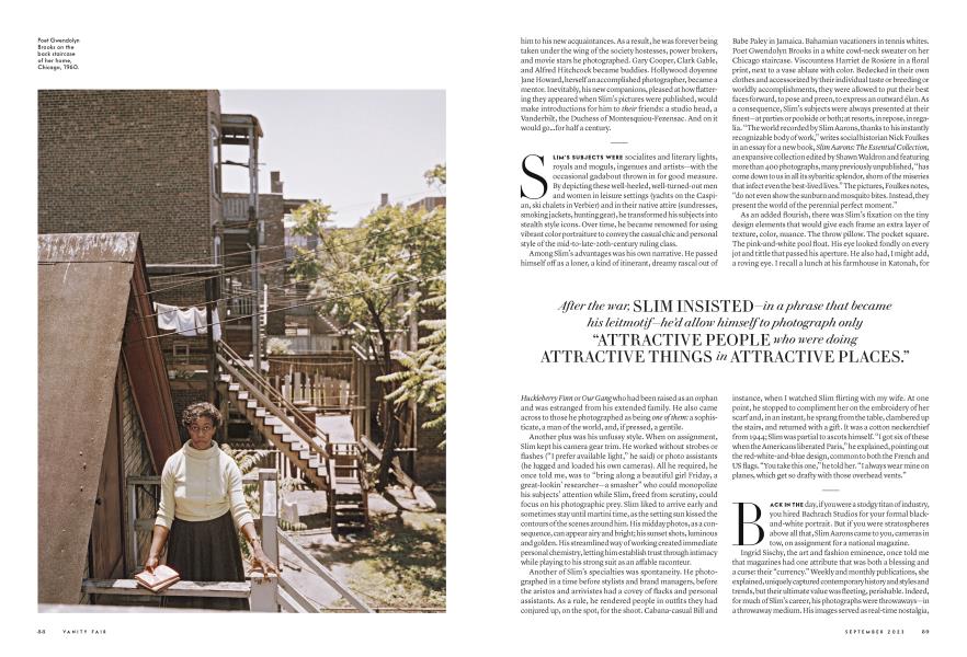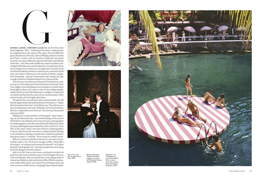 September 2023 DAVID FRIEND Slim AaronsGeorge Aarons—everyone called the six-foot-four-inch New Englander “Slim”—had the good fortune to make pictures for magazines from the 1940s to the 1990s. His work filled the glossy showbooks of the day: Life and Holiday, Town & Country and Travel + Leisure, and, on occasion, Vanity Fair. His sunny portraits of postwar affluence captured the habits and habitats of the elite—and of the wider stylish class, whose socialites commingled with bohemians and trendsetters. Decades later, those same images from another era, through their buoyant mood and almost fetishistic attention to detail, have continued to hold sway over today’s influencers in the worlds of fashion, design, and advertising—a group of tastemakers who simply can’t get enough of Aarons’s idealized depictions of the good life.