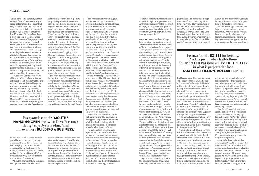 September 2023 Emily Jane Fox ANNIE WERMIELErika Ayers Badan kicked off her heels and sank into the quiet of her Connecticut home. It was the run-up to the spring sprint for Barstool Sports, the company she’s run for seven years. There was the Super Bowl, March Madness. And then there was the deal with Penn Entertainment, a casino and racetrack company, to fully acquire Barstool, after buying a third of the business years earlier, with plans to take on the whole thing in 2023. She knew it was coming, but these last few weeks were filled with the minutiae of it. She paid visits to all of the cable business channels to field questions about what this would mean for the company, which, since its founding, revolutionized the way media companies build community and make actual money and step in shit by being unapologetically themselves. (Barstool being itself meant being relentlessly chaotic and behaviorally tricky.) She led town halls with hundreds of employees. She recorded episodes 260 and 261 of her podcast, Token CEO (on Barstool, of course). She bought David Portnoy a bottle of wine from 2003—the year he founded Barstool as a free hometown subway newspaper in Boston, backed by $25,000 from his parents, for other Red Sox bros commuting. “The people at Barstool Sports are a bunch of average Joes, who, like most guys, love sports, gambling, golfing,” he wrote in his first issue, “and chasing short skirts.”