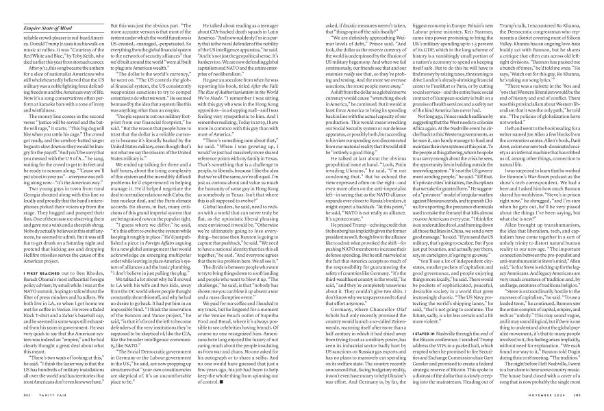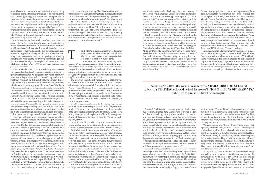 Farage is close friends with Stephen K. Bannon—the single person who has done the most to throw these big systemic questions into the maelstrom of Western public debate. When I got to the NATO summit, Bannon had just headed off to serve a four-month federal prison sentence for contempt of Congress. But Bannon has turned his immensely influential War Room show—which has continued to broadcast after his incarceration, with guest hosts—into a cross between a daily troop muster and a policy training school, which he uses to tutor millions of "peasants," as he likes to phrase his target demographic, on how this global power structure actually functions. He has made it both a mission and a business to illuminate the "link between capital markets and geopolitics," as one show focus has it, and the workings of what he calls the "dollar empire." Farage has said that without Bannon, whose Breitbart London was loudly supportive of the effort, "I'm not sure we would have had a Brexit."