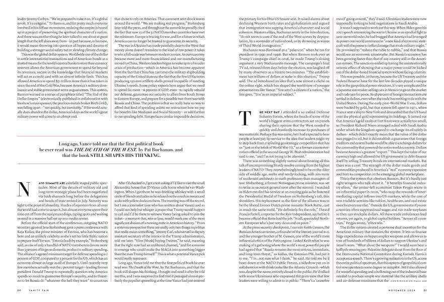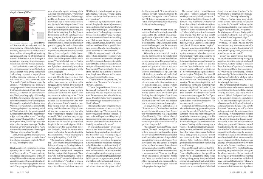 When Russia invaded Ukraine in February 2022, NATO's leaders stood in almost perfect unison, saying the American-led apparatus that had given Washington its new wealth and importance was facing an existential risk. It was "the great battle for freedom," President Joe Biden said. "A battle between democracy and autocracy, between liberty and repression, between a rules-based order and one governed by brute force." The theme of this year's meeting was unity, in standing up to a challenge to America's ability to set the rules governing security and stability around the world. Butjustashort, sweatywalk from the summit, a surreal "DC split screen," as one Politico reporter described it, was unfolding at the Capital Hilton—where insurgents and critics of this system were speaking at the National Conservatism Conference (NatCon). The foreign policy buzzword was multipolarity—a dry-sounding term, but one that hints at an epochal shift away from a world where America and its allies are able to control practically all financial, military, and technological structures. Policymakers in Washington were looking to China and talking in terms approaching panic about how unprepared America was for a new era of great-power conflict. Ukrainian troops would soon be outnumbered five to one on parts of the Donbas front. As the leaders and delegations of 32 member nations began arriving at Andrews Air Force Base, dread was growing that half of America's electorate was lining up behind an America-first movement that had embraced this multipolar vision as one that would benefit regular Americans at home, even if it saw us lose our overwhelming power abroad. War was already raging at the periphery of the empire. But the more pressing fear was that America might soon have a government run by people who wanted to unmake it from within. "Unity, resolve, purpose, all that good stuff," one highly placed European delegate said to me in a private aside. "That's what the show's for. But obviously there is this gigantic question mark hanging over the whole thing about what's going to happen in November."