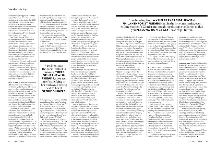 SEPTEMBER 2024 Hannah SeligsonNOT TOO LONG ago, a non-Jewish lifelong New Yorker who grew up on the Upper East Side was asked by a friend to host a screening of the documentary film Israelism. She immediately said no. It wasn't that she necessarily disagreed with the message of the film—which bills itself as the story of "young American Jews battling the old guard to redefine Judaism's relationship with Israel, revealing a deepening generational divide over modern Jewish identity." Rather, this would-be screening host feared "being socially exiled by many of her Jewish friends" and "possible career consequences. I want to be brave," she told me. "I'm disappointed in myself."