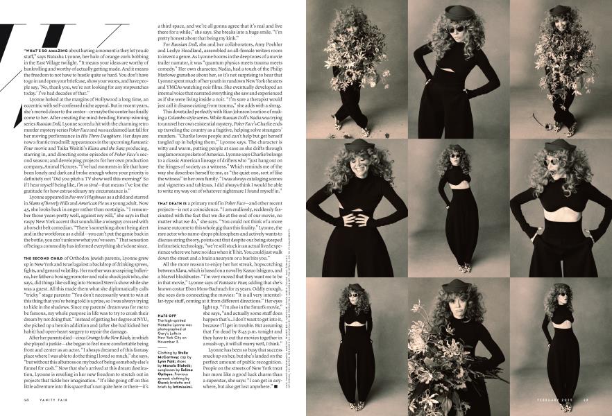 Sign In Not a Subscriber?Join Now"WHAT'S SO AMAZING about having a moment is they let you do stuff," says Natasha Lyonne, her halo of orange curls bobbing in the East Village twilight, "it means your ideas are worthy of bankrolling and worthy of actually getting made. And it means the freedom to not have to hustle quite so hard. You don't have to go in and open your briefcase, show your wares, and have people say, 'No, thank you, we're not looking for any stopwatches today.' I've had decades of that."
