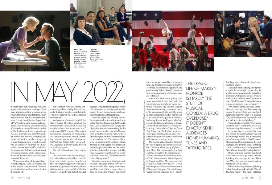 MARCH 2025Smash, the short-lived 2012 TV series, developed a dedicated cult following. Now, Steven Spielberg and company have resurrected it for Broadway. Michael Riedel tells the backstory of the original show and the new production, revealing the mad rhapsodies of making a musical