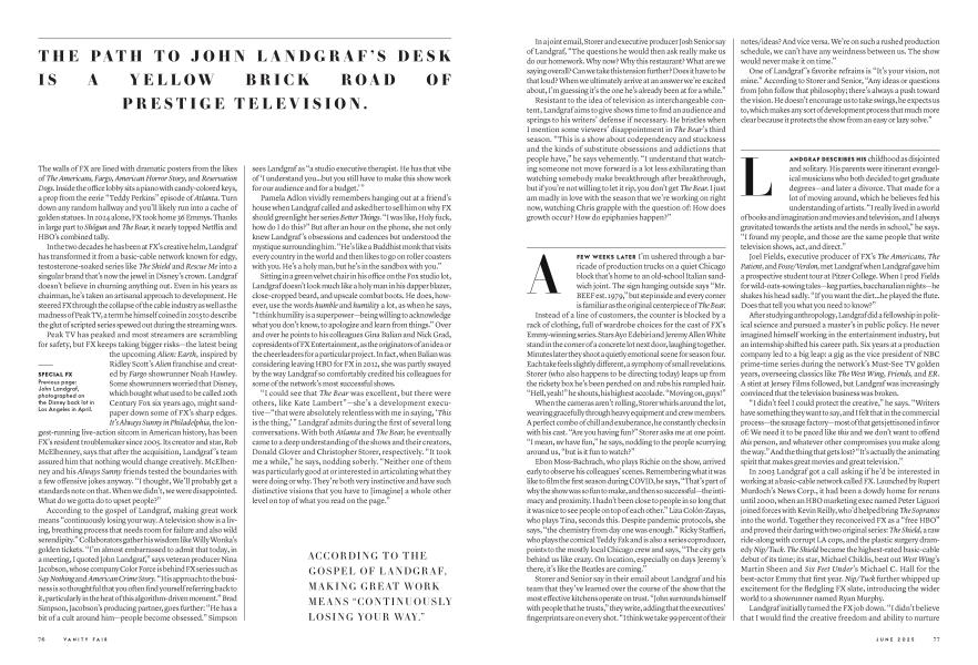 JUNE 2025 JOY PRESS ART STREIBERThe path to John Landgraf’s desk is a yellow brick road of prestige television. The walls of FX are lined with dramatic posters from the likes of The Americans, Fargo, American Horror Story, and Reservation Dogs. Inside the office lobby sits a piano with candy-colored keys, a prop from the eerie “Teddy Perkins” episode of Atlanta. Turn down any random hallway and you’ll likely run into a cache of golden statues. In 2024 alone, FX took home 36 Emmys. Thanks in large part to Shōgun and The Bear, it nearly topped Netflix and HBO’s combined tally.