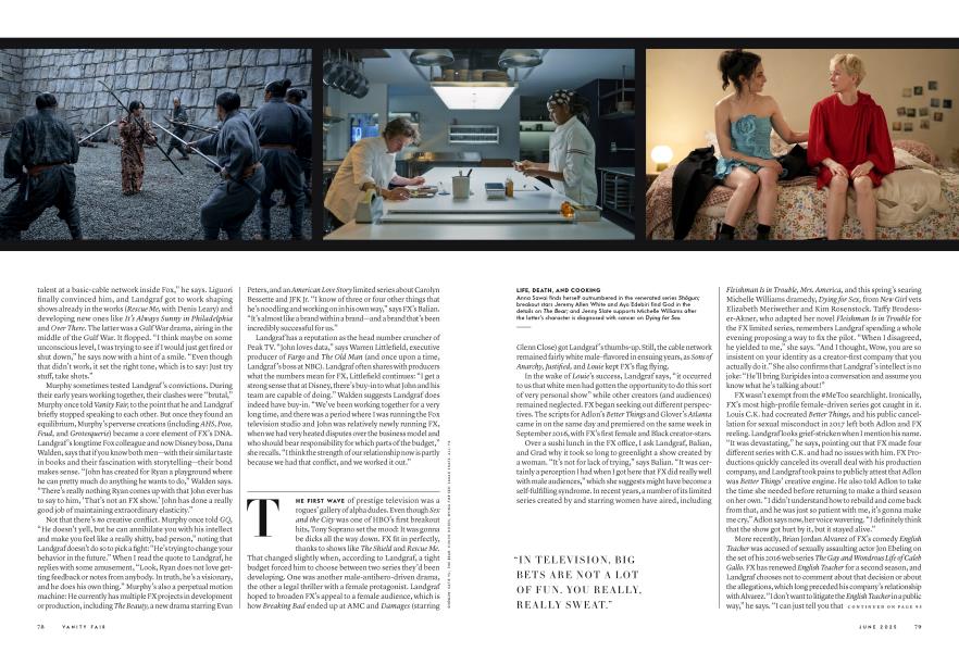 Murphy sometimes tested Landgraf’s convictions. During their early years working together, their clashes were “brutal,” Murphy once told Vanity Fair, to the point that he and Landgraf briefly stopped speaking to each other. But once they found an equilibrium, Murphy’s perverse creations (including AHS, Pose, Feud, and Grotesquerie) became a core element of FX’s DNA. Landgraf’s longtime Fox colleague and now Disney boss, Dana Walden, says that if you know both men—with their similar taste in books and their fascination with storytelling—their bond makes sense. “John has created for Ryan a playground where he can pretty much do anything he wants to do,” Walden says. “There’s really nothing Ryan comes up with that John ever has to say to him, ‘That’s not an FX show.’ John has done a really good job of maintaining extraordinary elasticity.”